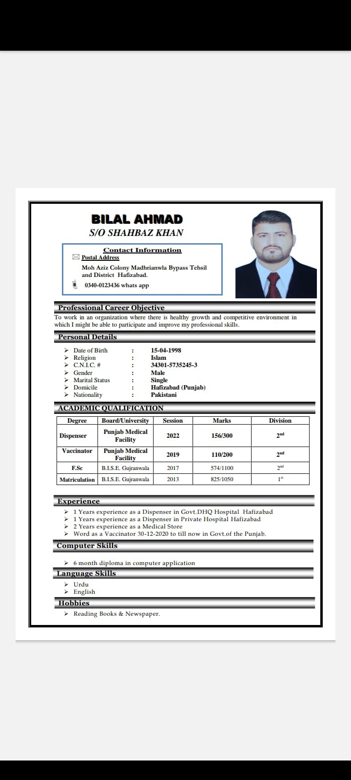 My name is Bilal Ahmad ,I'm diploma holder's Dispenser diploma from Punjab medical facility and Vaccinator diploma from Punjab medical facility