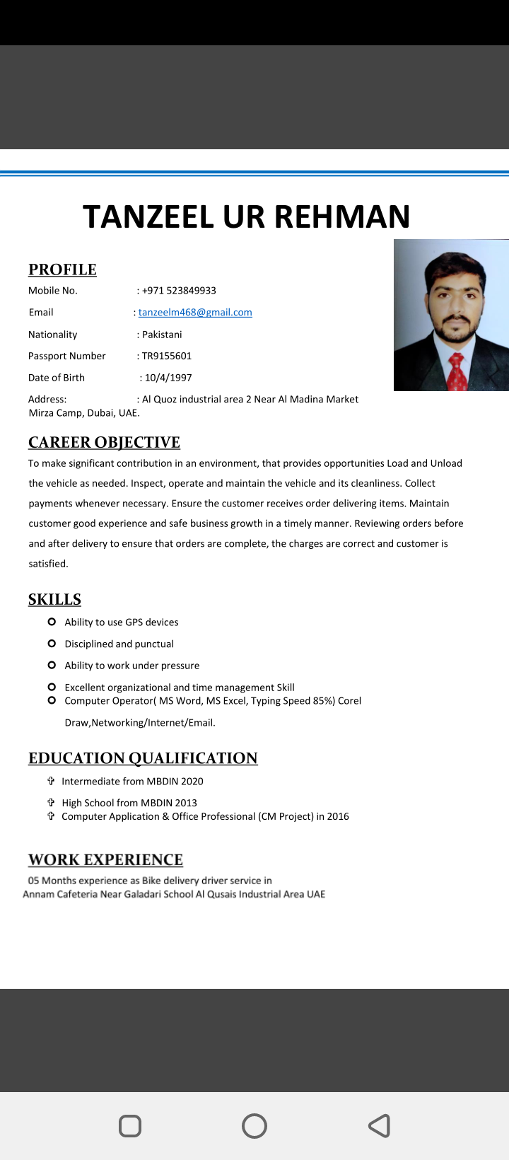 I am a bike rider I am on two year visa in dubai and my education is intermediate I also have computer diploma and bike license also I need job very much