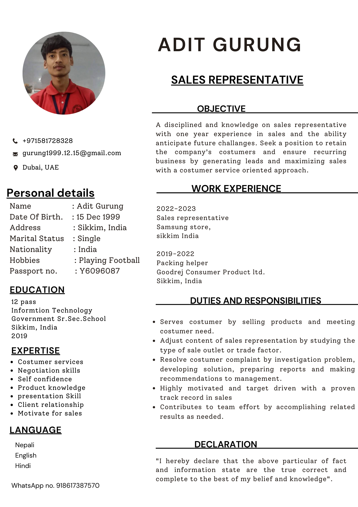 I am Adit gurung from India i have completed my schooling from my home country than after I worked in pharmaceutical company as a packing helper than after I quite my job from pharmaceutical company and again I joined in mobile shop as a sale representative so I want to grow up my career in retail sector. I am a hard working person, self motivated and positive attitude.