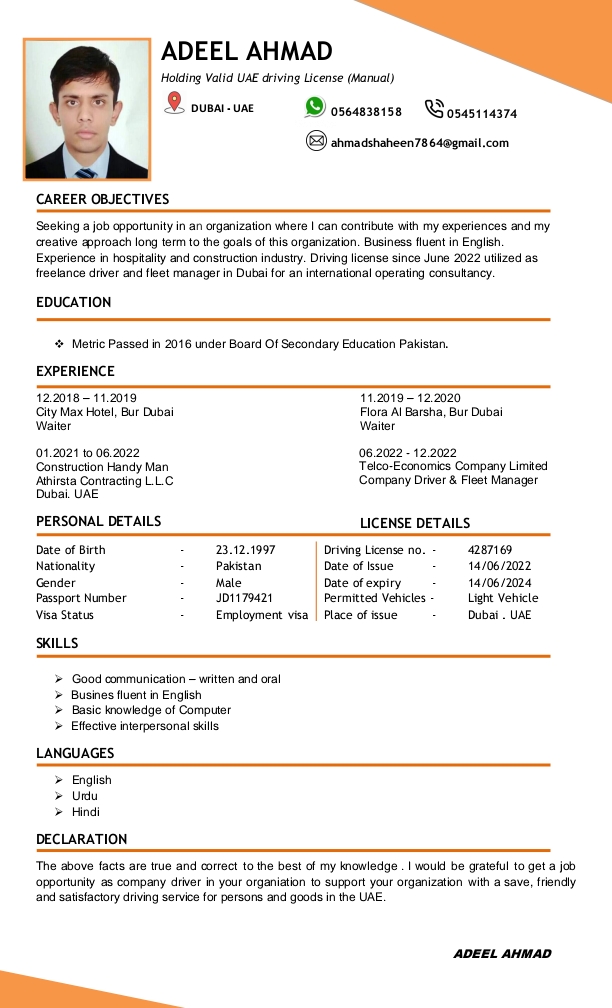 I am living Dubai four years, I have experience two waiters and one year driving, I have Dubai license number one year old